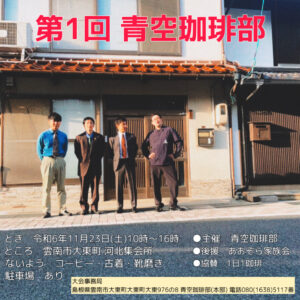 前回のイベントから2年越し、完全自主企画単独イベントを開催します。俺たちは生きてます。帰ってきた青空珈琲部! 『第1回 青空珈琲部』 日時: 11月23日(土)10:00〜16:00 場所: 河北集会所(島根県雲南市大東 […]