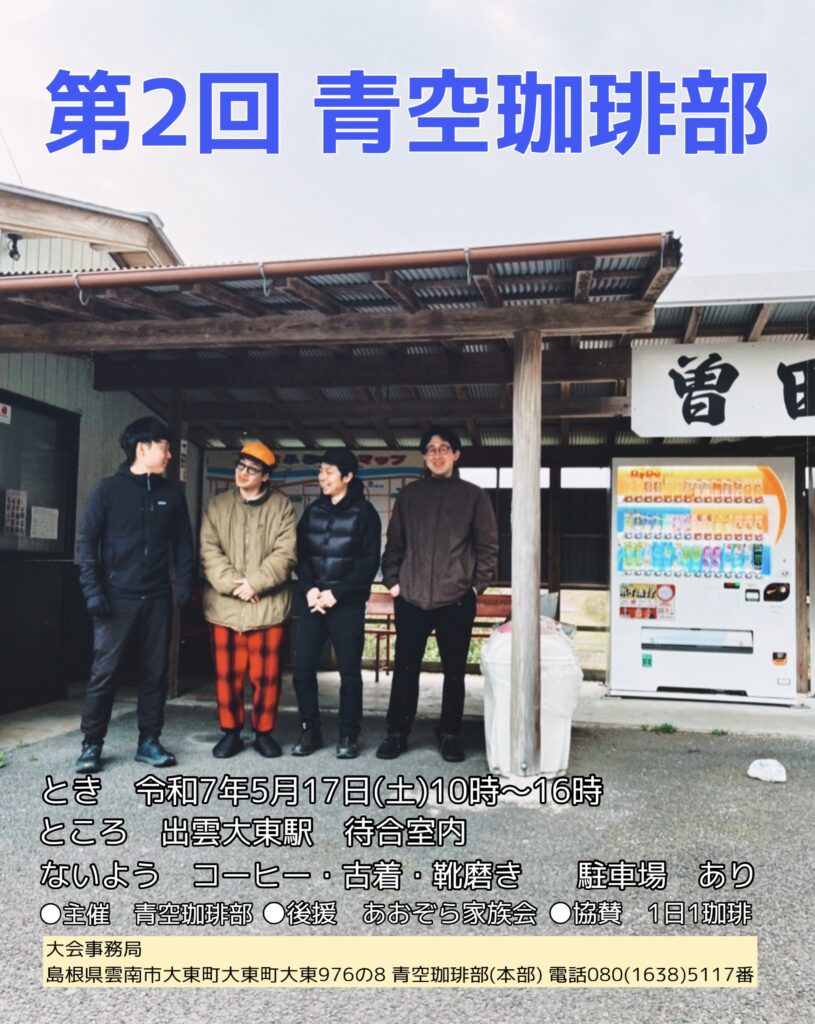 2025/04/07 2025年、青空珈琲部、始めます。 お待たせしました! 2025年、青空珈琲部、始めます。 『第2回 青空珈琲部』 日時: 5月17日(土)10:00〜16:00 場所: 出雲大東駅 待合室内(島根県雲南市大東町飯田) 内容:コーヒー提供・古着販売・靴磨き 駐車場:あり 詳細は追ってインスタのストーリーや投稿等でお知らせしていくのでお見逃しなく🖐️
